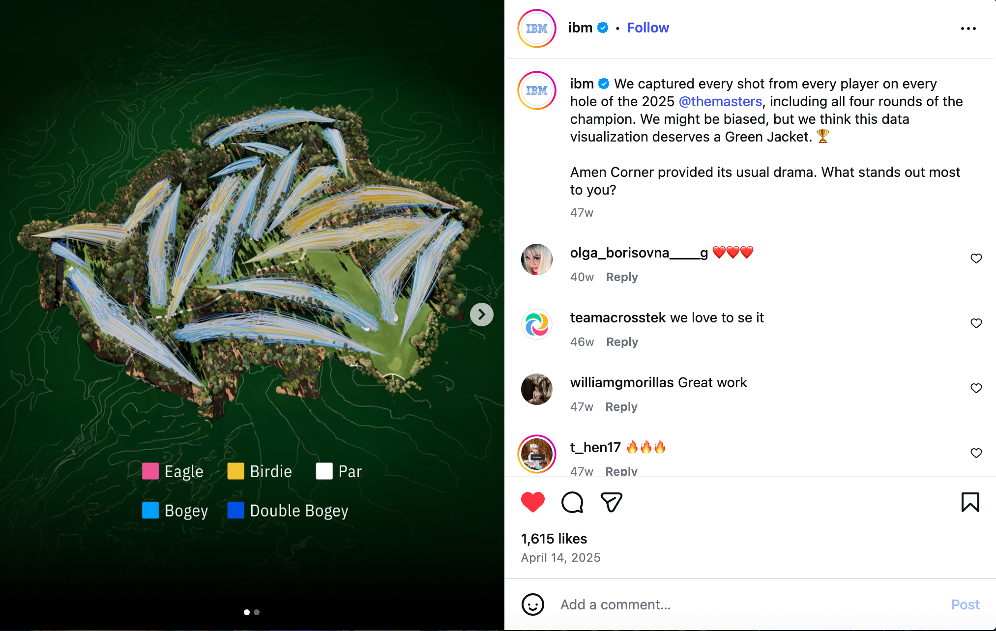 As a key contributor to IBM's partnership with the Masters Tournament, Spotlight Social Media led digital campaigns that boosted brand visibility and engagement. Our expertise in paid social media strategy and content ideation resulted in a 170% increase in traffic to IBM.com/Masters through targeted Instagram ads.